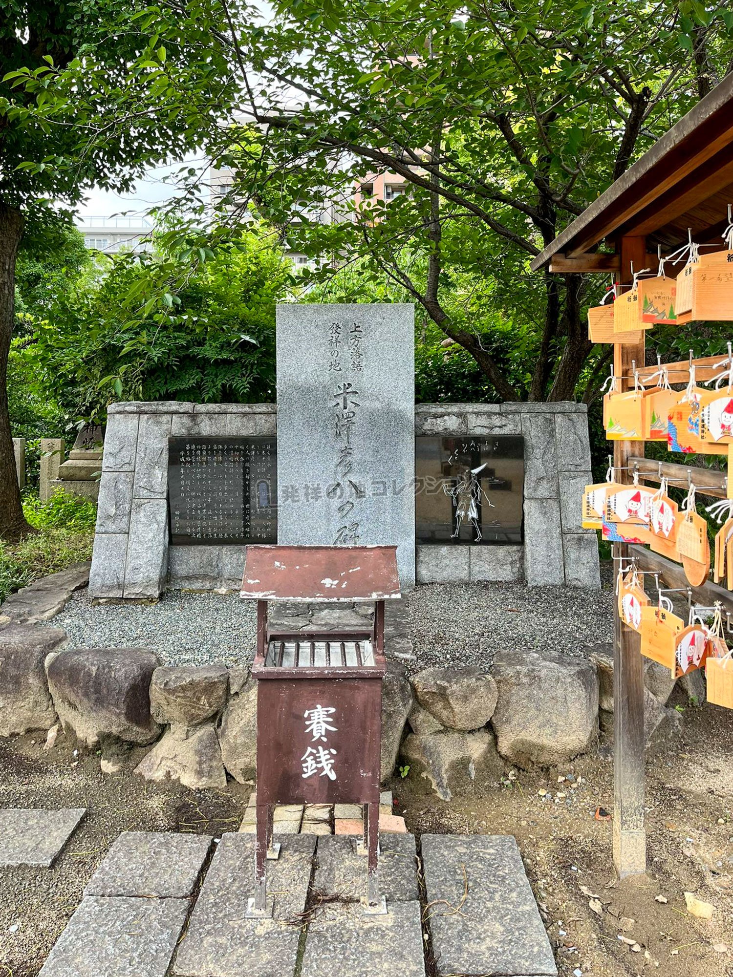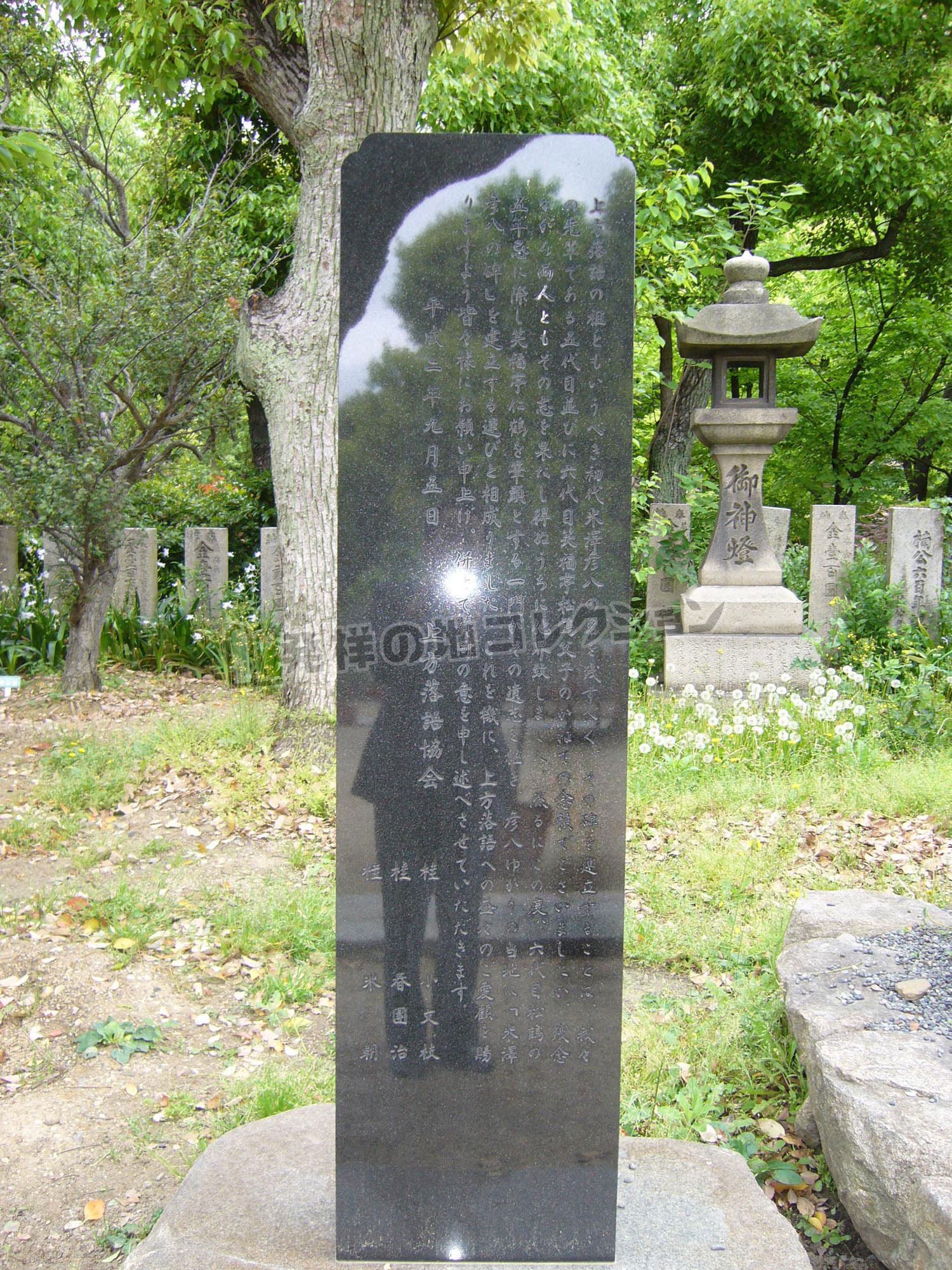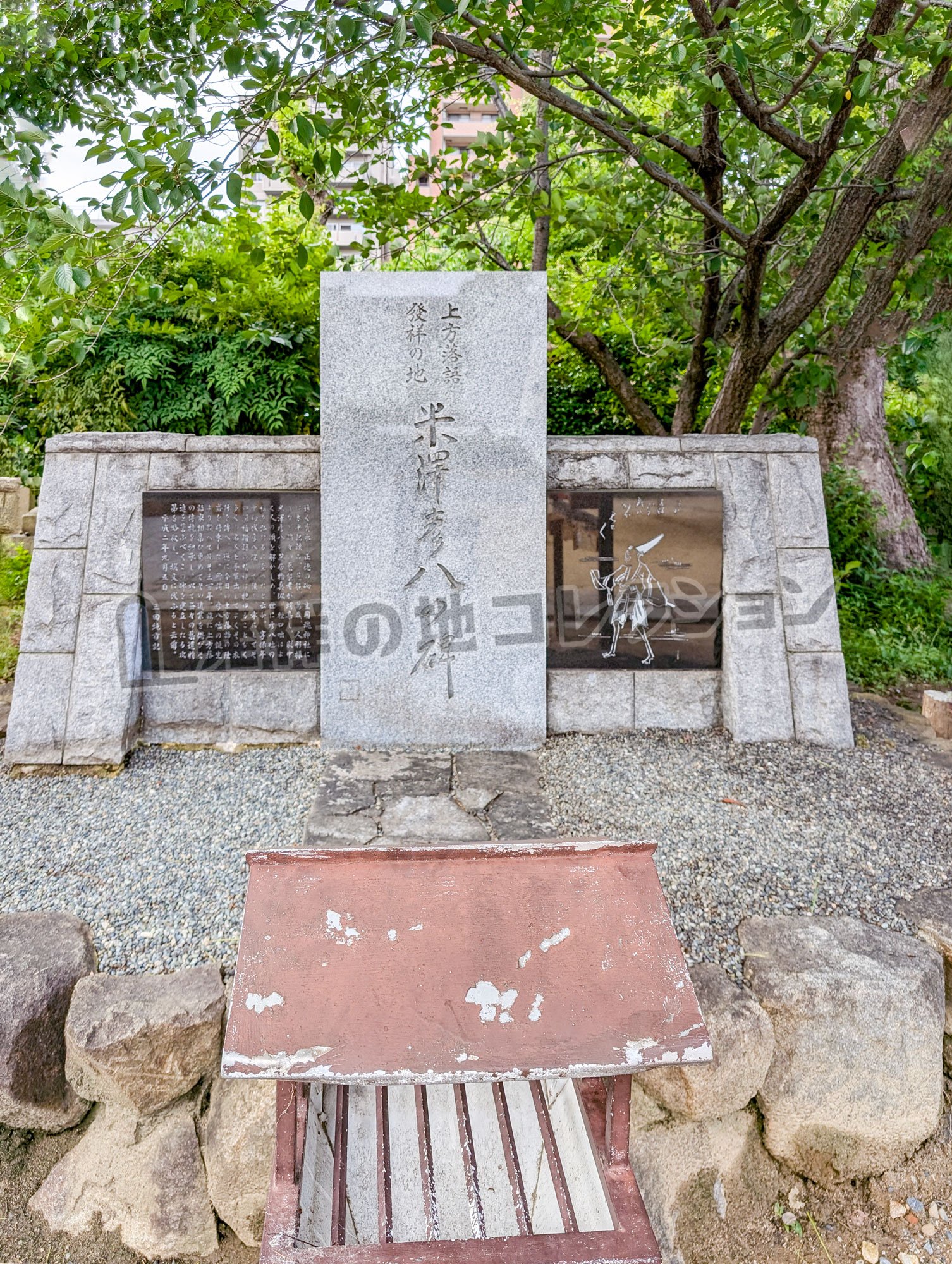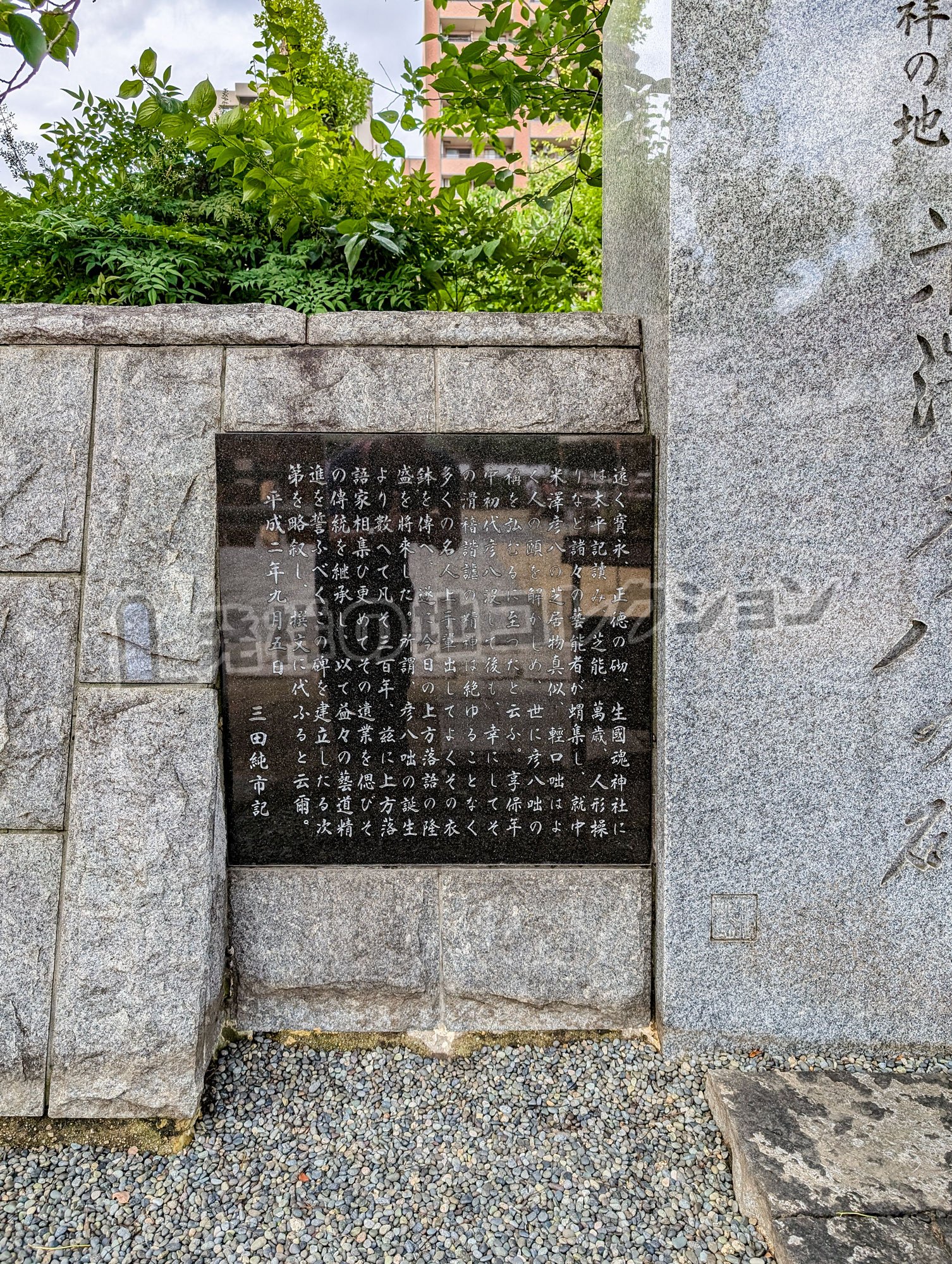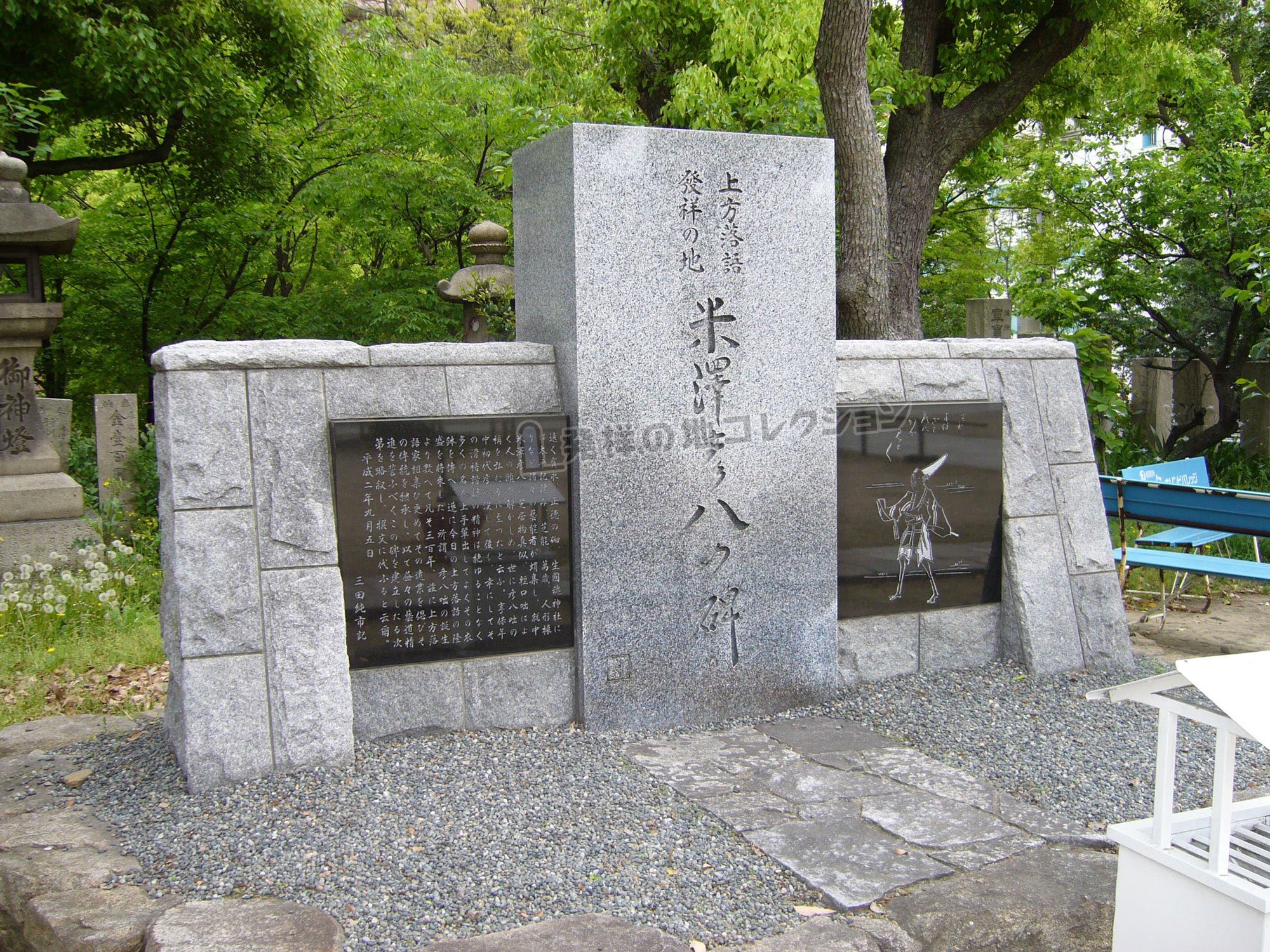 米澤彦八の碑遠く寛永,正徳の砌,生國魂神社に は太平記読み,芝能,萬歳,人形操 りなど諸々の芸能者が蝟集し,就中 米澤彦八の芝居物真似,軽口咄はよ く人の頭を解かしめ,世に彦八咄の 称を弘むるに至ったと云ふ。享保年 中初代彦八没して後も,幸にしてそ の滑稽諧謔の精神は絶ゆることなく 多くの名人上手輩出してよくその衣 鉢を伝へ,逐に今日の上方落語の隆 盛を招来した。所謂,彦八咄の誕生 より数へて凡そ三百年,茲に上方落 語家相集ひ更めてその遺業を偲びそ の伝統を継承し,以て益々の芸道精 進を誓ふべくこの碑を建立したる次 第を略叙し,撰文に代ふると云爾。