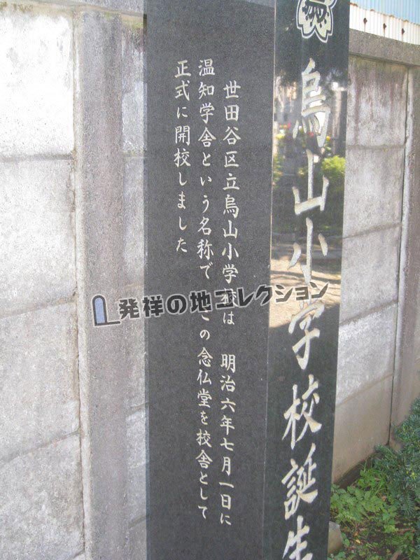 烏山小学校は,明治6年(1873) に ここ念仏堂を校舎に利用して「温知学舎」として誕生した。この時の行政区画は 神奈川県多摩郡烏山村であったが,明治26年(1893)に東京府に移管された。