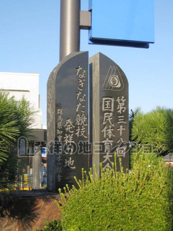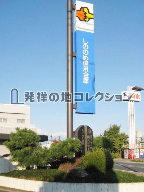 高崎線 新町駅から北に150m。新町駅から北に通る県道179号 新町停車場線が国道17号を越えてすぐ しののめ信用金庫新町支店がある。その敷地の南隅に楯を縦2つに切り割った形の黒御影石の発祥碑が建っている。