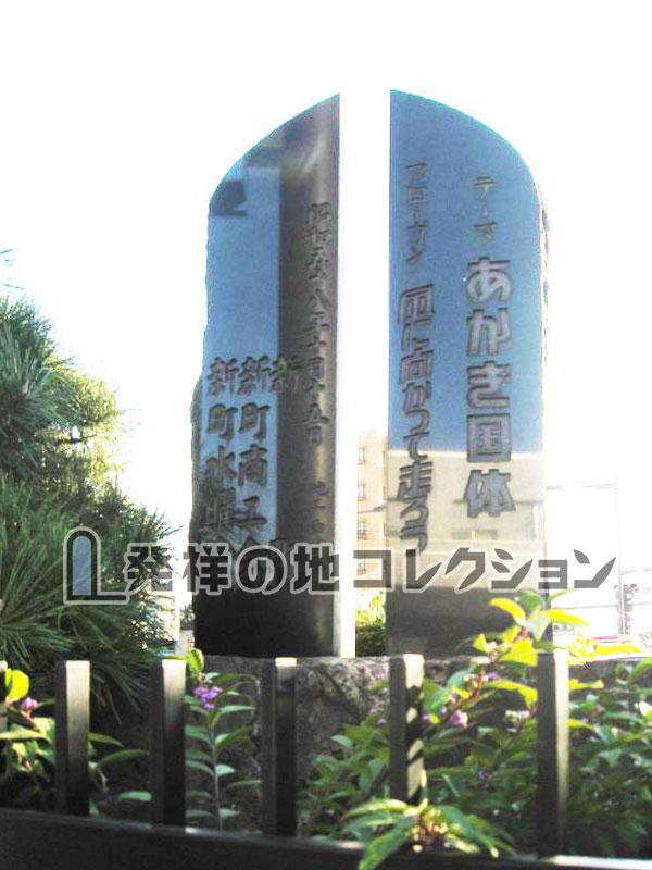 住民体育館は新町中学校・新町第一小学校に隣接する場所にあり,そこから南西に500mのこの地は 新町の玄関口であるため発祥碑がここに建てられたようだ。