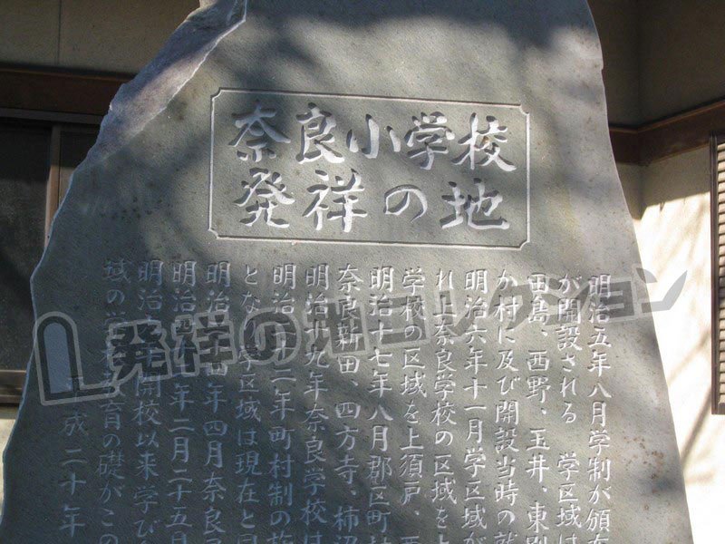奈良小学校は 旧 大里郡奈良村に設置された小学校。明治6年(1873)に 集福寺の建物を借りて「奈良小学校」を開校。 当時の学区域や新しい学校との分離の経過は 碑文に詳しく書かれている。