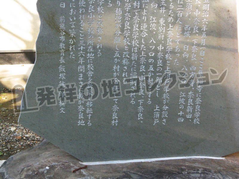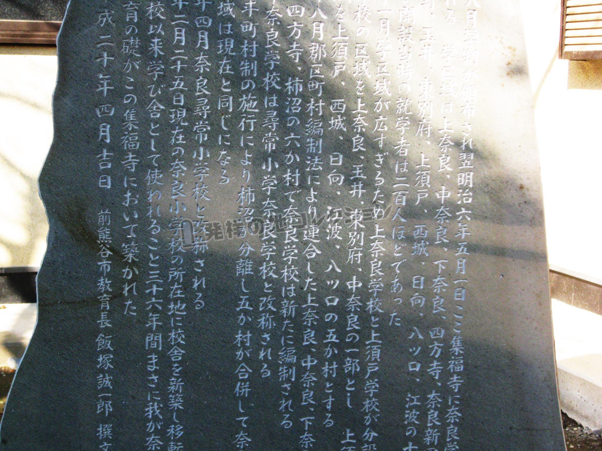 明治四十二年二月二十五日現在の奈良小学校の所在地に校舎を新築し移転する 明治六年開校以来学び舎として使われること三十六年間まさに我が奈良地 域の学校教育の礎がこの集福寺において築かれた平成二十年四月吉日 前熊谷市教育長 飯塚誠一郎 撰文