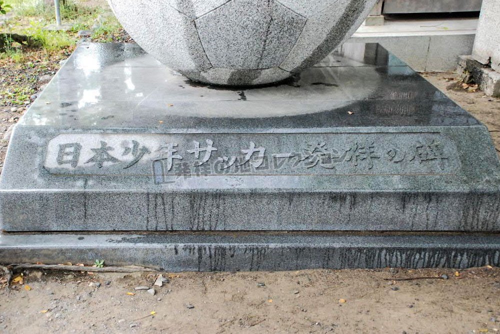 東海道線 清水駅から西に600m。清水江尻小学校の南に隣接して魚町稲荷神社(静岡市清水区江尻町14-74)がある。社殿に向かって左手前に,直径1.5mほどの 御影石製のサッカーボールのオブジェが置かれ、台座には「日本少年サッカー発祥の碑」と刻まれて,横には由来を記した副碑が建っている。