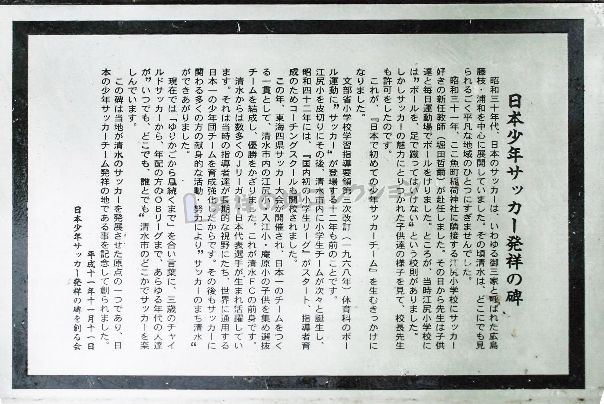 少年サッカーの活動に関しては碑文に書かれている通り,江尻小学校に赴任した教師の努力によるところが大きい。昭和31年(1956)に 日本で初めての小学校のクラブ活動としてのサッカーチームが結成され, その後 徐々に近隣の小学校にチームが結成されていった。 昭和42年(1967)になって江尻小学校など数校の生徒から選抜した “オール清水”チームが結成され,全国で圧倒的な強さを誇った。