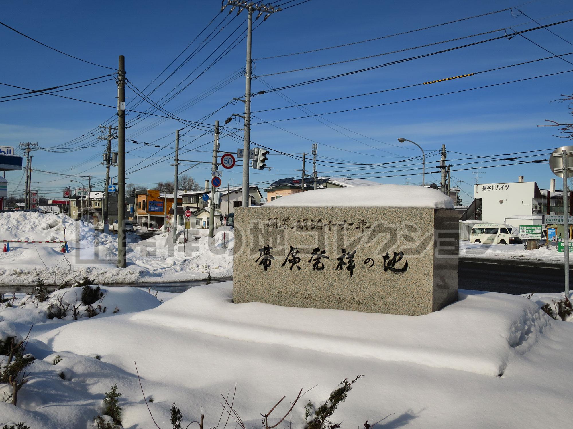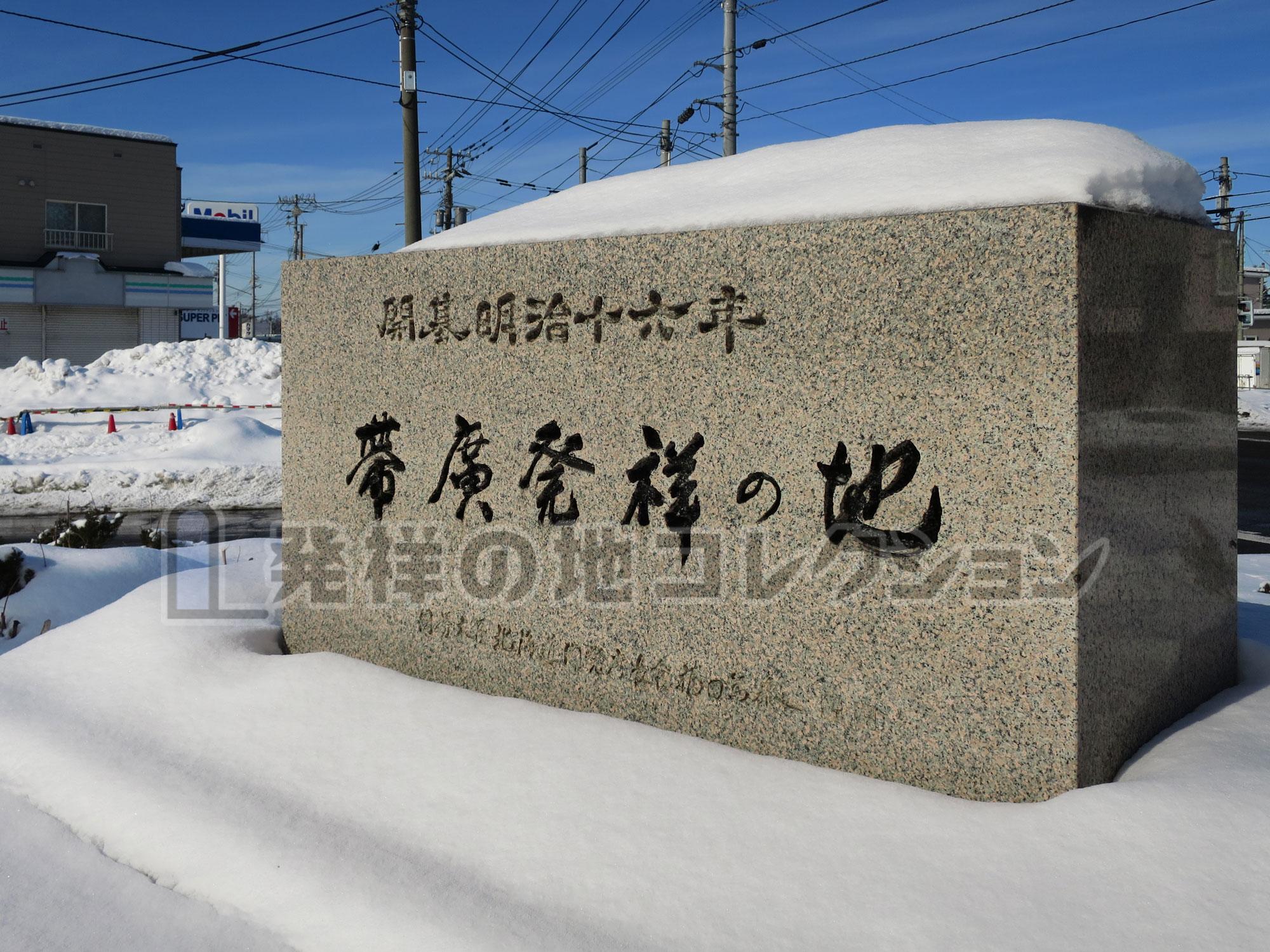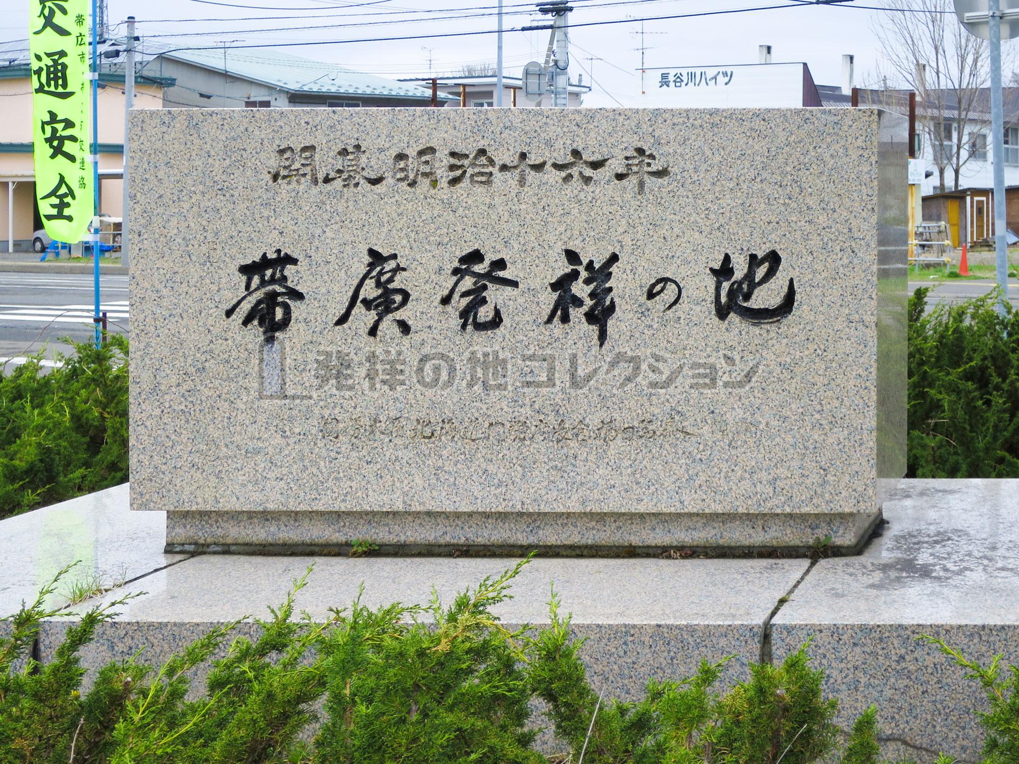 帯広駅から北東へ2.5kmほど。帯広国道38号線沿いの東9条南5丁目交差点の三角地帯に「帯広発祥の地」の碑が立つ。帯広開拓に尽力した依田