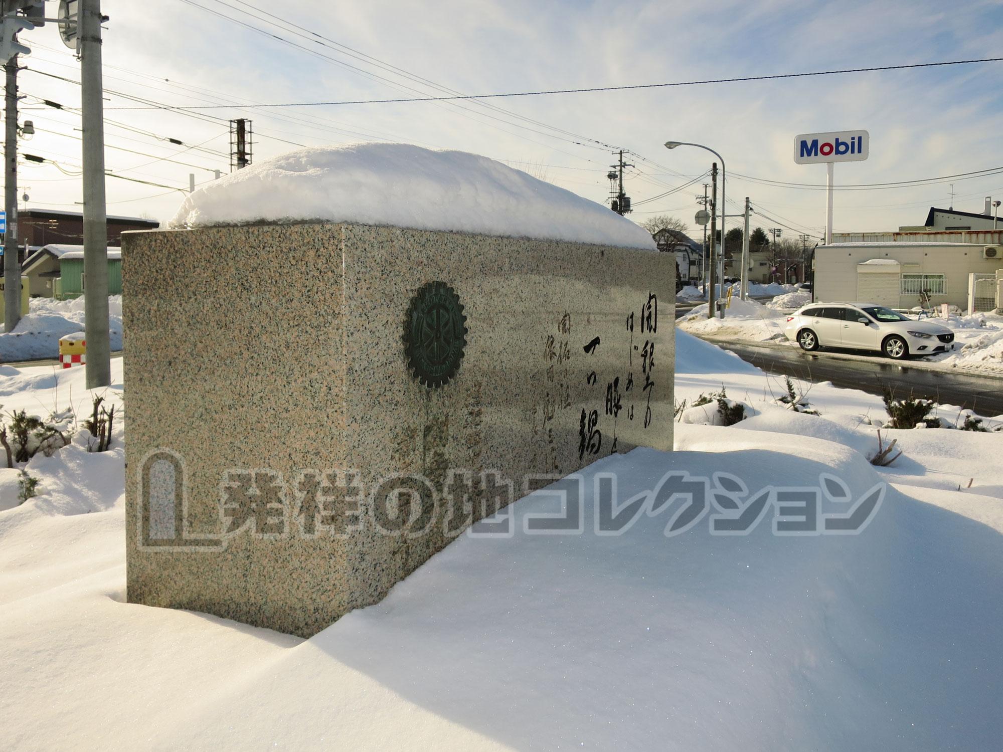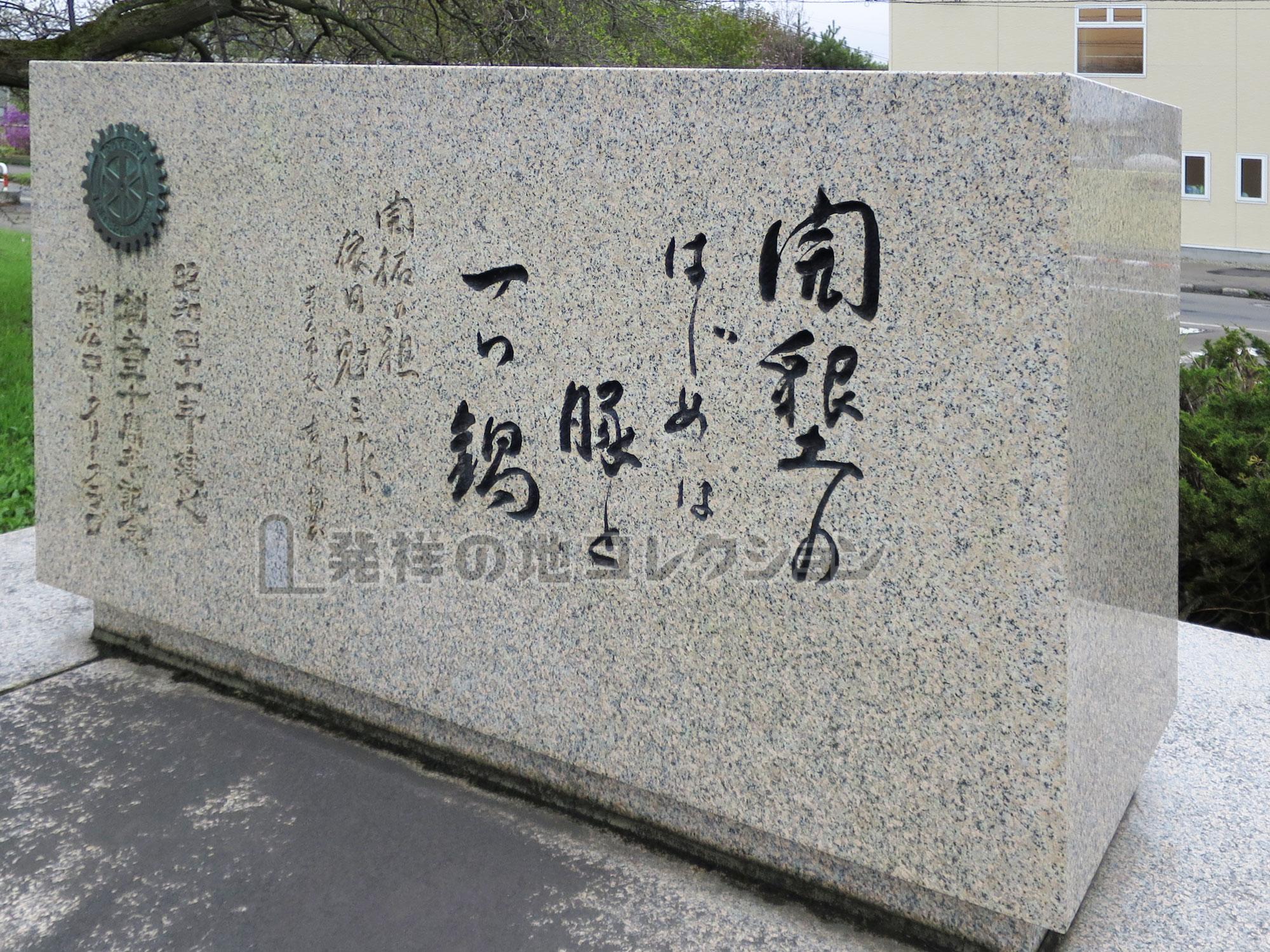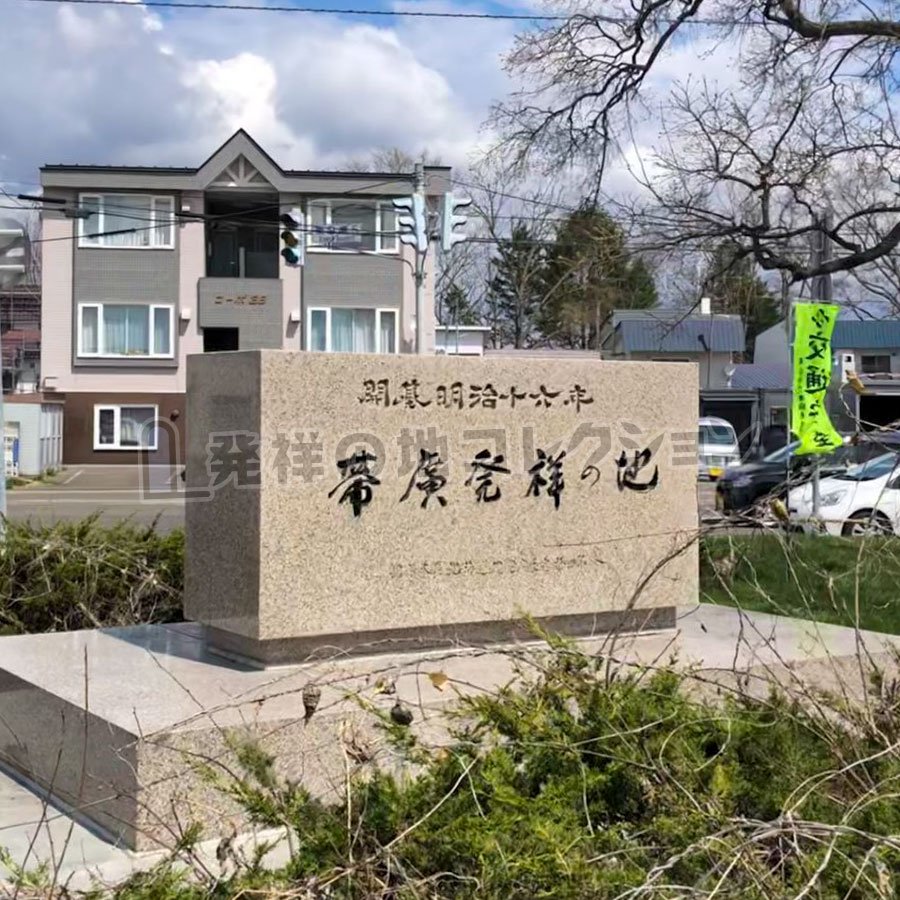 帯広駅から北東へ2.5kmほど。帯広国道38号線沿いの東9条南5丁目交差点の三角地帯に「帯広発祥の地」の碑が立つ。帯広開拓に尽力した依田