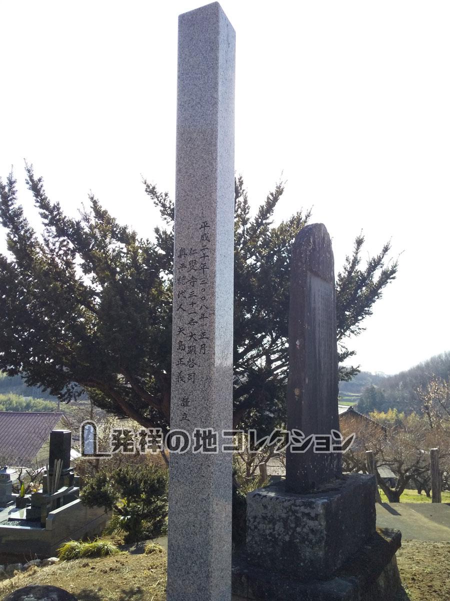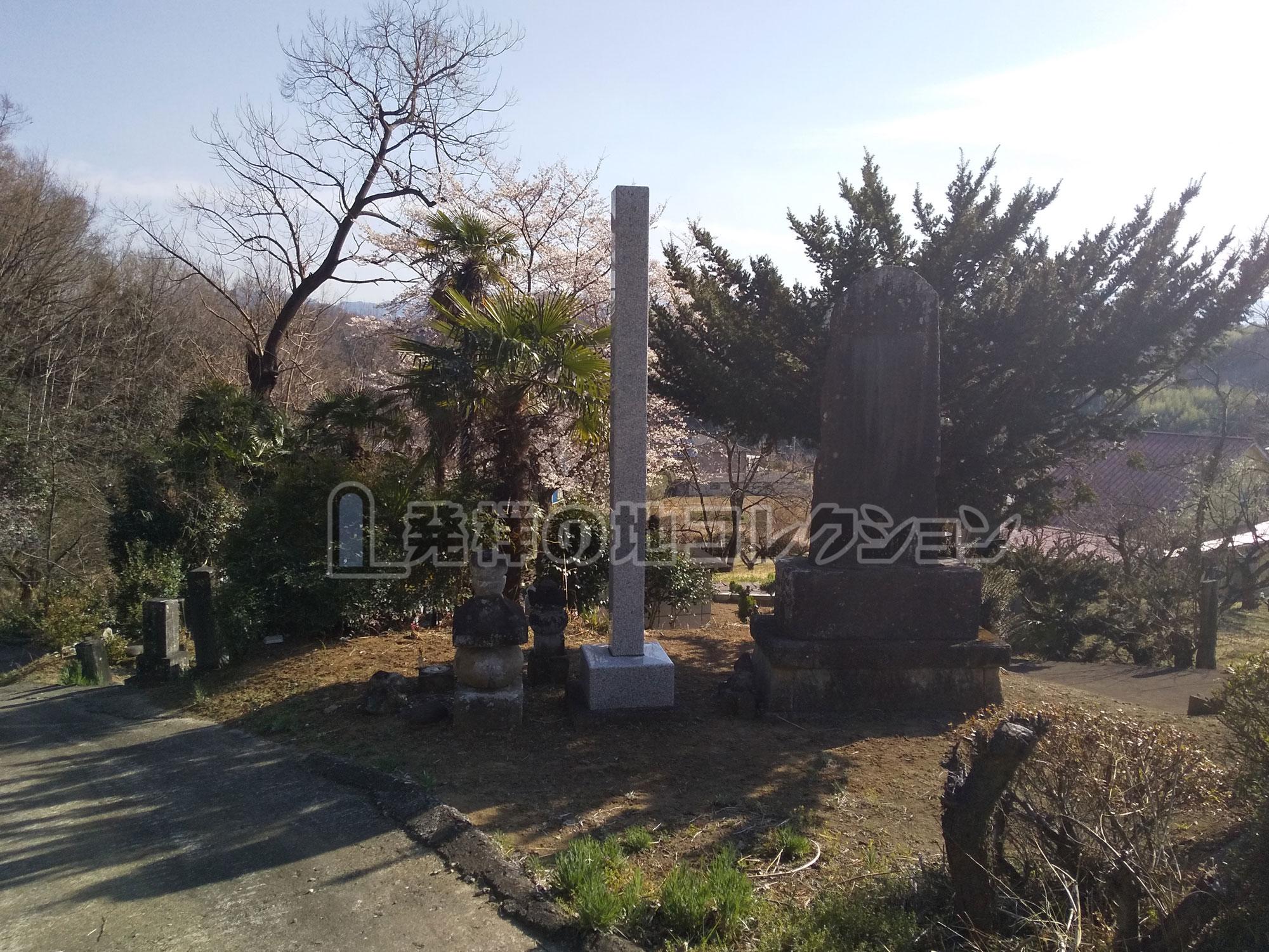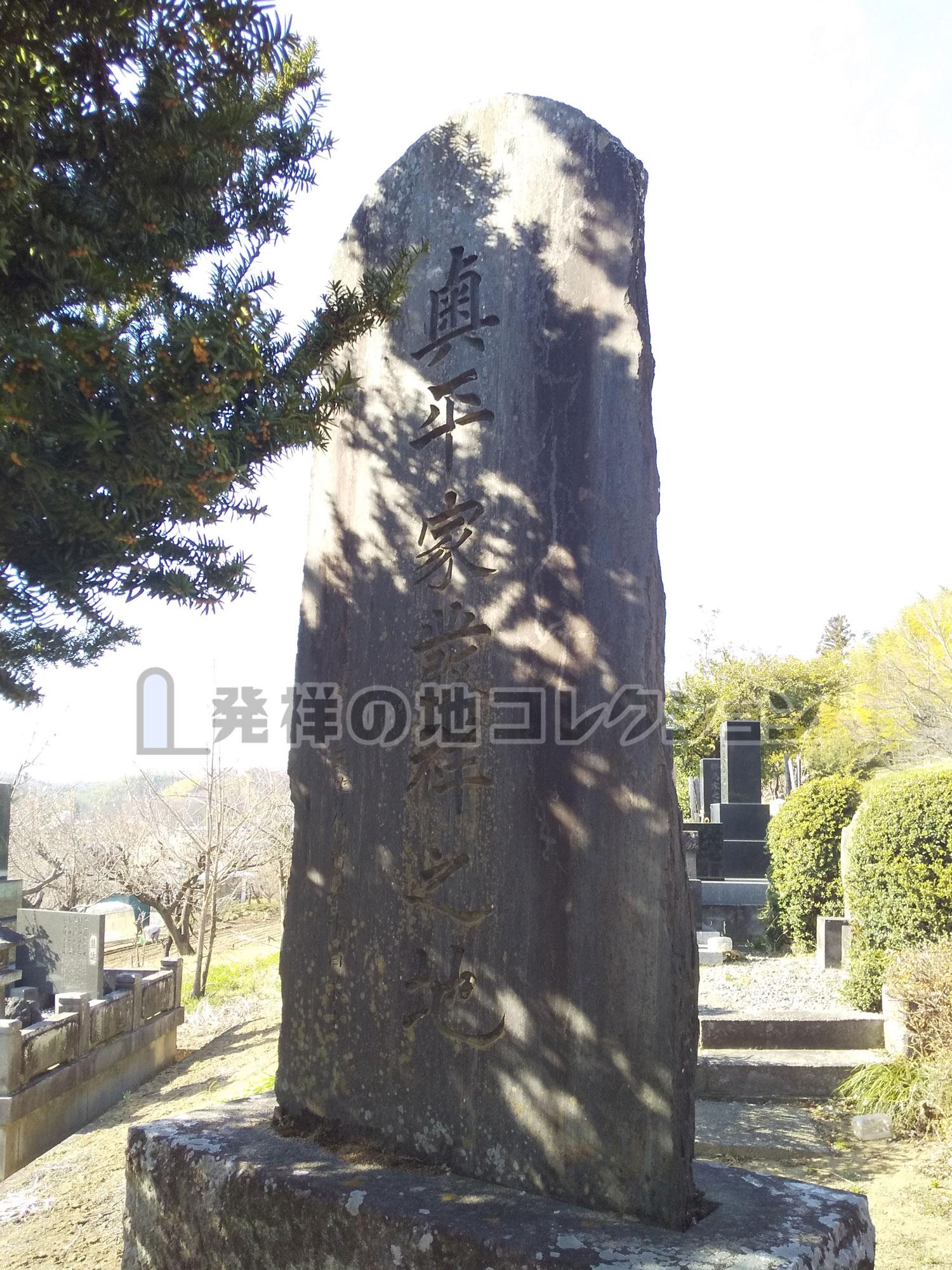 上信電鉄 西吉井駅から北2.5km。下奥平の岩平小学校付近から北の上奥平方面に進み,奥平神社の100m程手前の細い道をを北東に入る。 斜面を上って最も奥まった所に墓地があり,奥平一族の墓の中央に大きめな発祥碑が建っている。奥平氏が開基したとされる