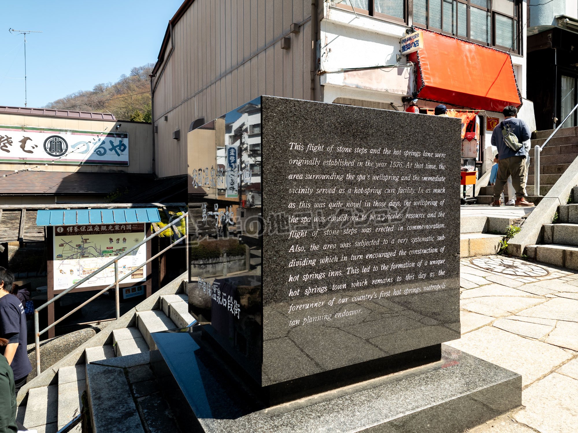 当時温泉宿は 源泉の近くにあったが, 合戦による多数の負傷者の治療のため, 広い現在の場所へ移転した。この時 山上に湧きだしている温泉を効率よく宿に供給するために, 石段と温泉街が計画的に作られた, と言われている。