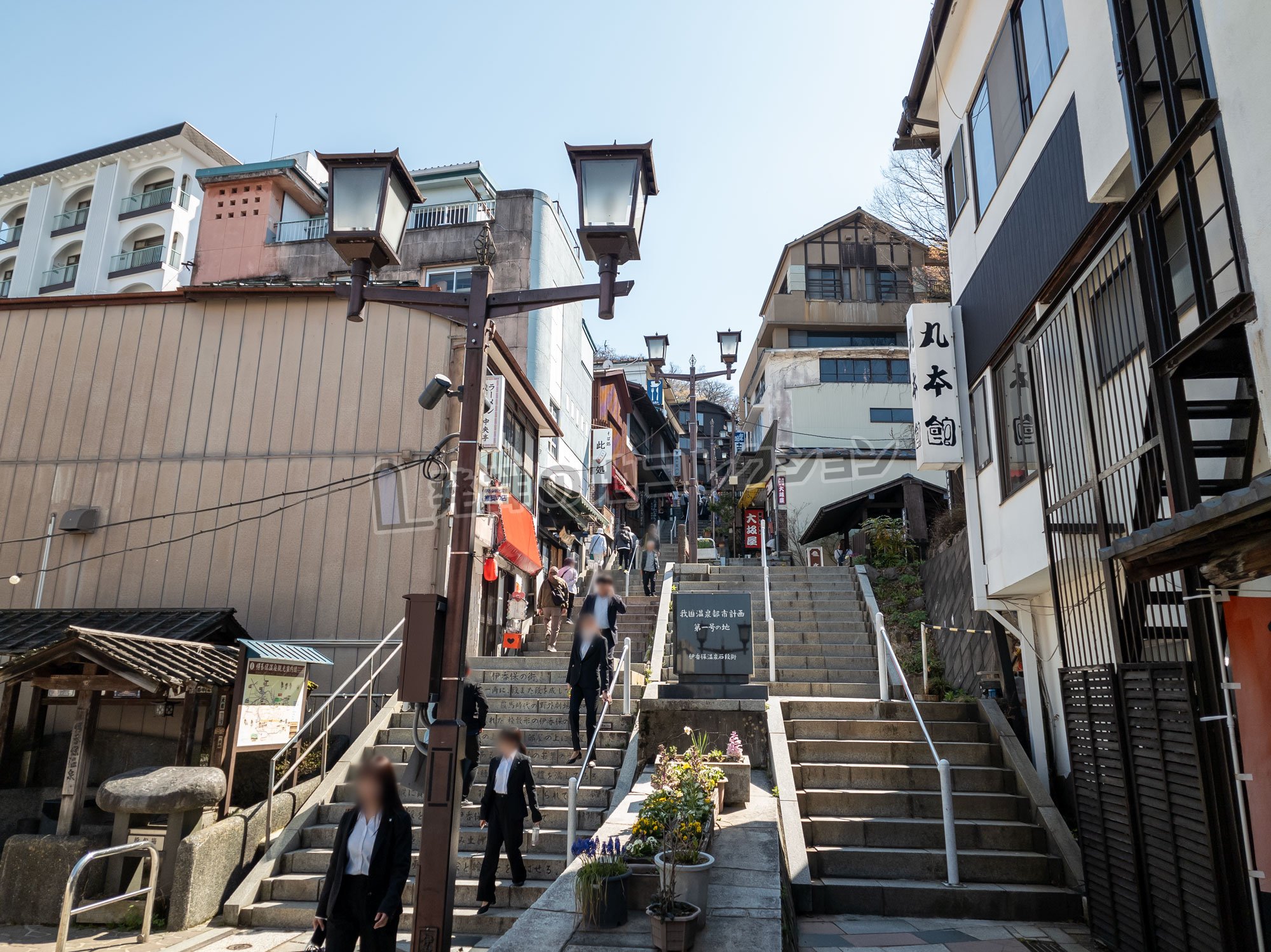 This flight of stone steps and the hot springs lane were originally established in the year 1576. At that time, the area surrounding the spa's wellspring and the immediate vicinity served as a hot-spring cure facility. In as much as this was quite novel in those days, the wellspring of the spa was considered to be a priceless resource and the flight of stone steps was erected in commemoration. Also, the area was subjected to a very systematic sub- dividing which in turn encouraged the construction of hot springs inns. This led to the formation of a unique hot springs town which remains to this day as the forerunner of our country's first hot spring metropoli- tan planning endeavor.