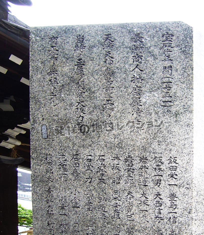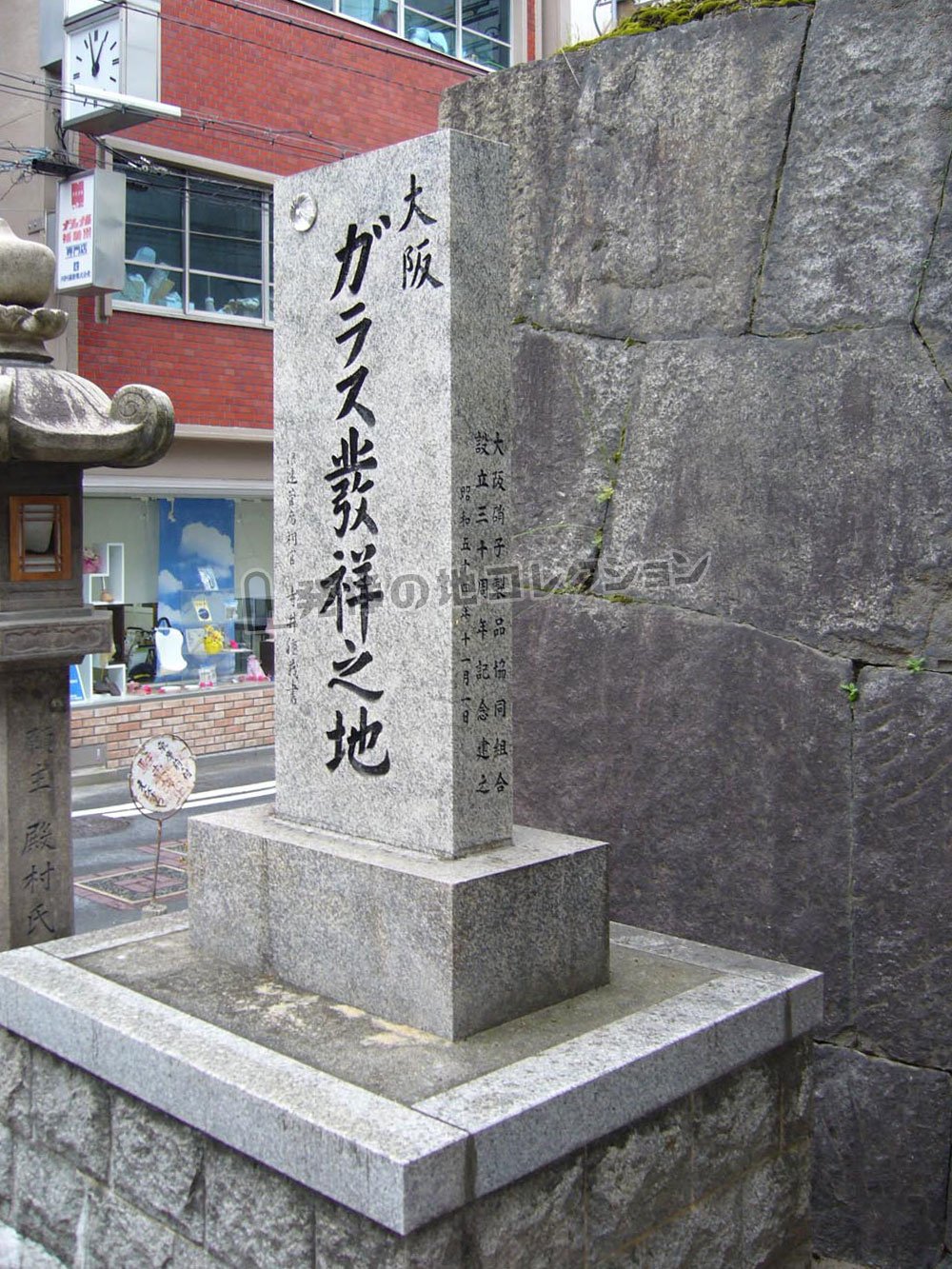 大阪地下鉄 南森町駅 あるいは 東西線 大阪天満宮駅から 南に200m。 天神橋筋商店街を南に進み, 大阪天満宮の正面西側に“えびす門”がある。門の外に「大阪 ガラス発祥の地」と刻まれた石碑が建つ。昭和54年(1979) 大阪硝子製品協同組合の設立30周年を記念して建立された。