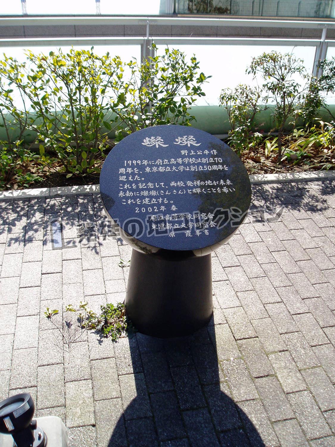 東急 東横線 都立大学駅から 北に500m。目黒区立めぐろ区民キャンパスに「パーシモンホール」がある。 敷地の北側の歩道に面して, 旧 都立大学の正門の門柱と 「燦燦」と題するモニュメントが 建っている。