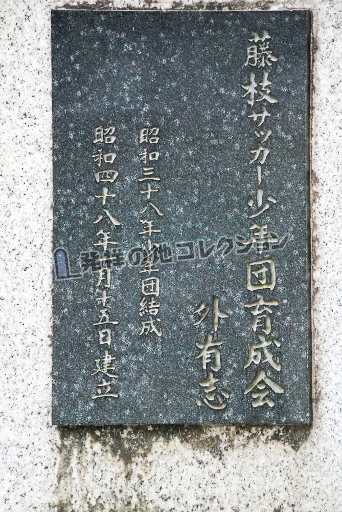 東海道線の藤枝駅から 北東に3km。蓮華寺池公園の東に市立藤枝小学校がある。 校門を入って右に進むと二人の少年がボールを蹴っている彫刻があって, その台座に「サッカー少年団発祥の地」と書かれている。