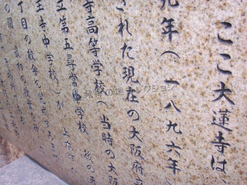 ここ大蓮寺は, 明治二十九年(一八九六年)に創立された現在の大阪府立天王寺高等学校(当時の大阪府立第五尋常中学校 後の天王寺中学校)が, 上本町八丁目の校舎の完成するまでの間, 最初の授業を行った記念すべき場所である。