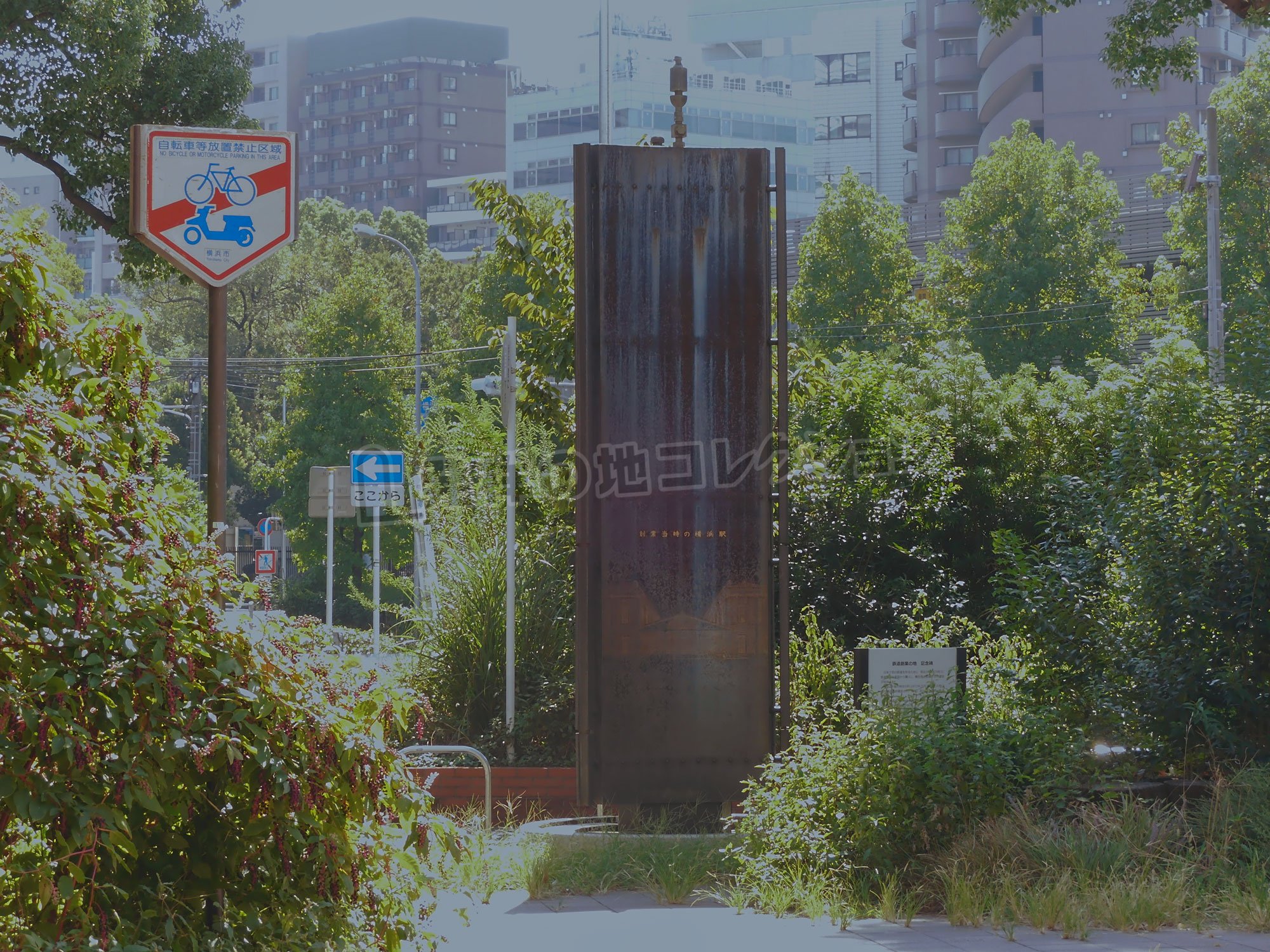京浜東北根岸線 桜木町駅から 100mほど関内駅寄りの、歩道橋に上がるエレベーター建屋横の暗い場所に、鋼鉄製のえらくガッチリした碑と説明板が建っている。この場所は 以前は駅のすぐ前だったと思われるが、駅の位置が横浜駅寄りに後退したため、現在はうす汚れた忘れられたような場所になっている。