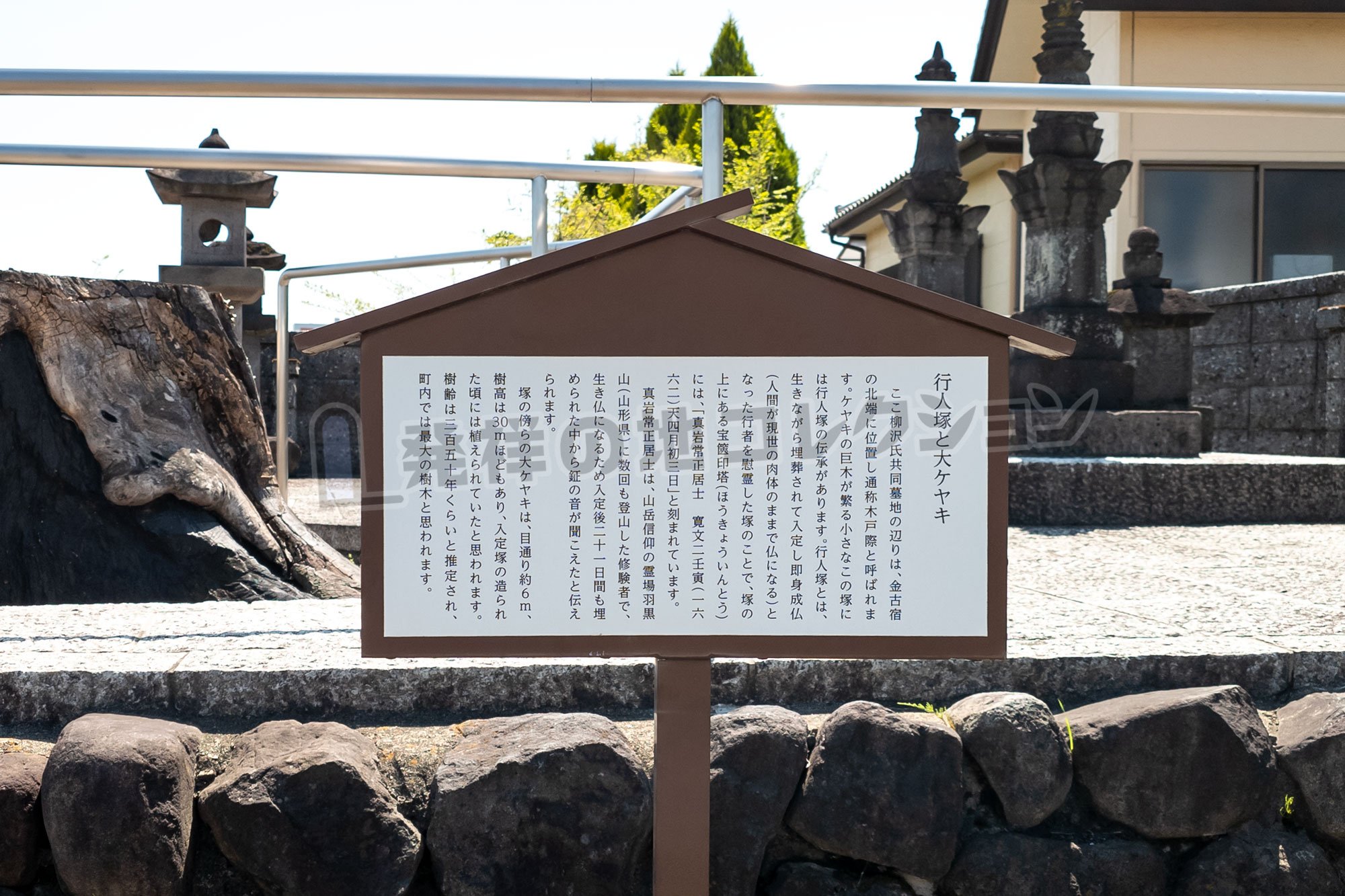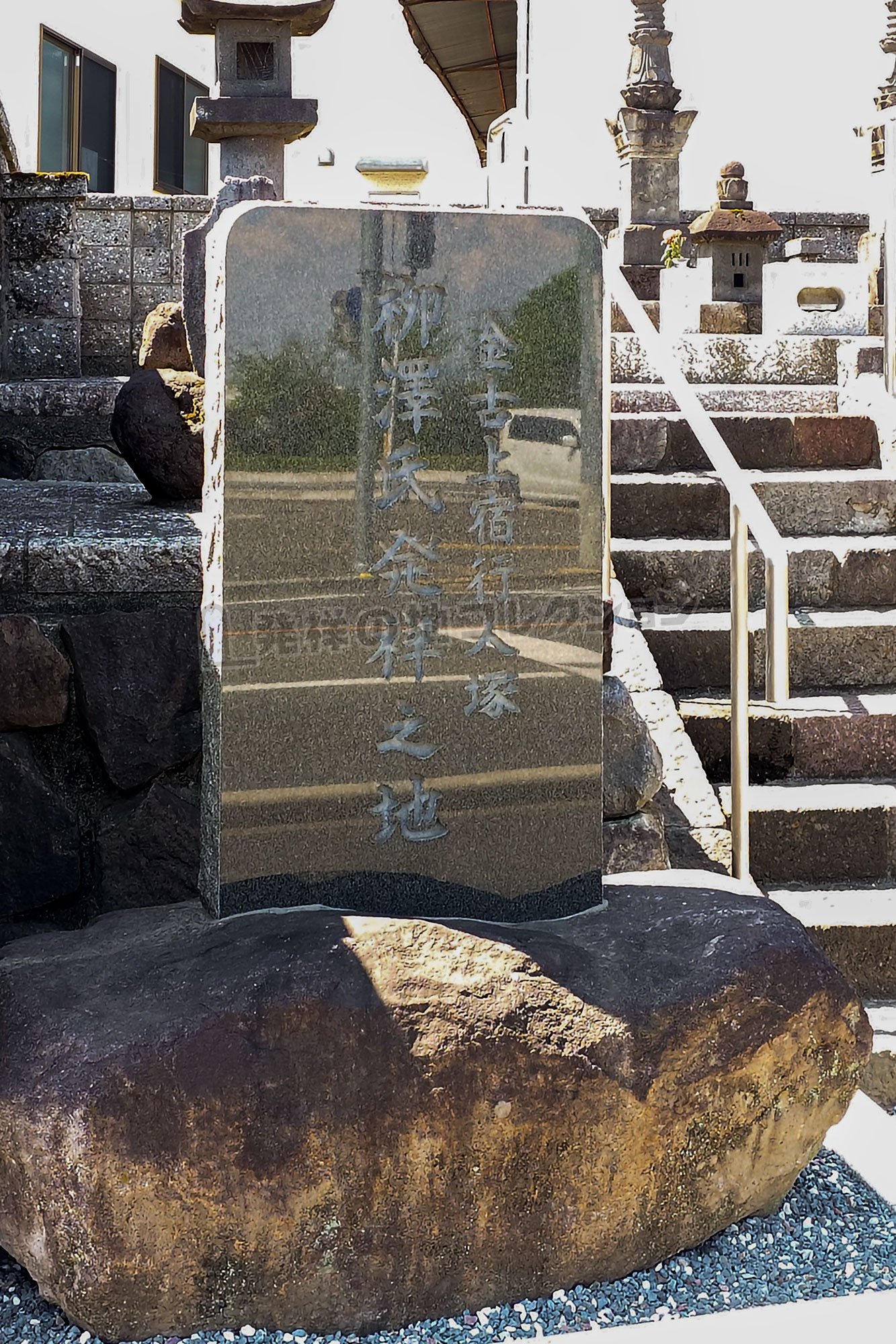 当地は柳澤氏の墓所だったようで、さらに行人塚ともなっているとのことだ。墓所は、高渋線が拡張したり、高渋バイパス建造の影響で常仙寺に移転し、行人塚と大ケヤキと石版の3点セットだけが残されている。
